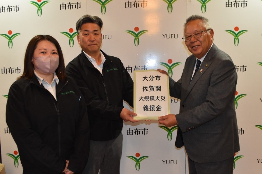 令和8年2月24日、株式会社クロレラ本社様が市役所を訪れ、株式会社クロレラ本社様と従業員一同様、株式会社キチセ様、プレットサンフーズ株式会社様(福岡県久留米市)からの義援金を由布市長(日本赤十字社由布市地区長)に手渡しました。 この義援金は「令和7年11月18日大分市佐賀関の大規模火災義援金」として、日本赤十字社を通じて被災地の方々の生活支援に活用されます。