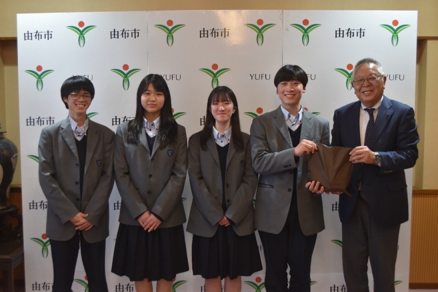 令和8年2月13日、大分県立由布高等学校生徒会様が市役所を訪れ、生徒の皆様からの義援金を由布市長(日本赤十字社由布市地区長)に手渡しました。この義援金は「令和7年11月18日大分市佐賀関の大規模火災義援金」として、日本赤十字社を通じて被災地の方々の生活支援に活用されます。