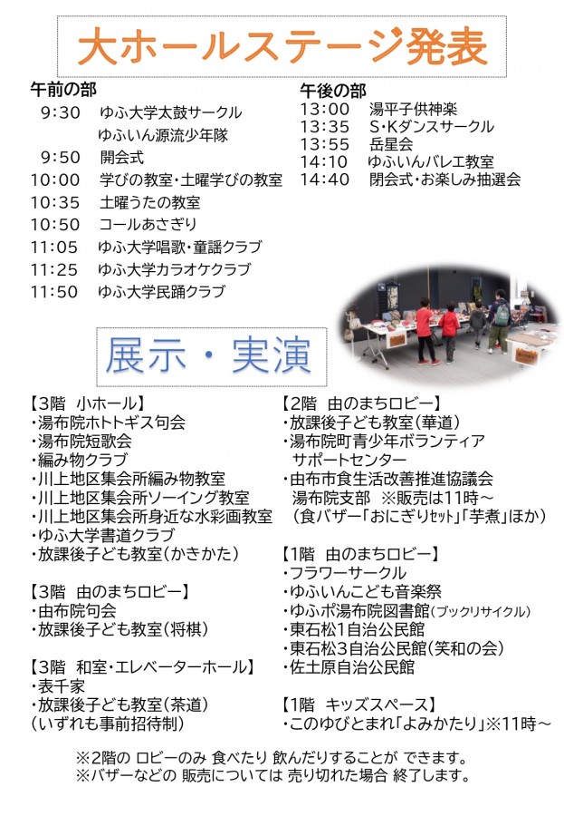 湯布院公民館を利用する団体のステージ発表や作品展示などさまざまな催しが行われますので、ぜひお越しください。詳細については下記チラシをご覧ください。