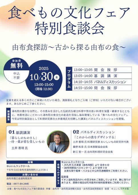 湯布院地域の不特定会場で著名な講師を招き、テーマに合わせた料理を食べながら食談義を交わします。