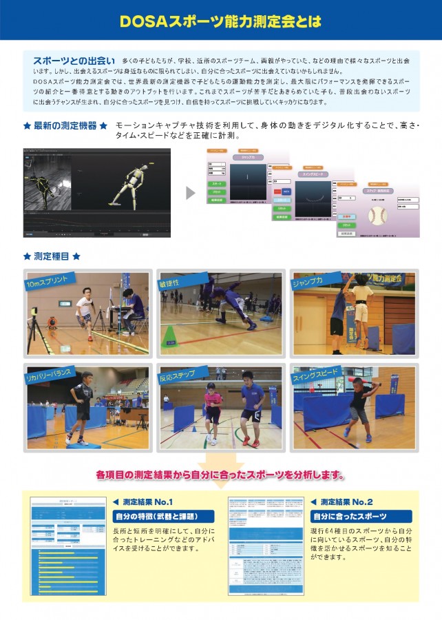 最新の測定機器(モーションキャプチャ技術)を活用して、体の動きをデジタル化することで、高さ・タイム・スピードなど6つの項目から正確に計測します。測定した結果から自分に合ったスポーツを知ることができます。また、今回の測定会には、スペシャルゲストとしてアーティスティックスイミング元日本代表の「青木 愛」さんも来場します!