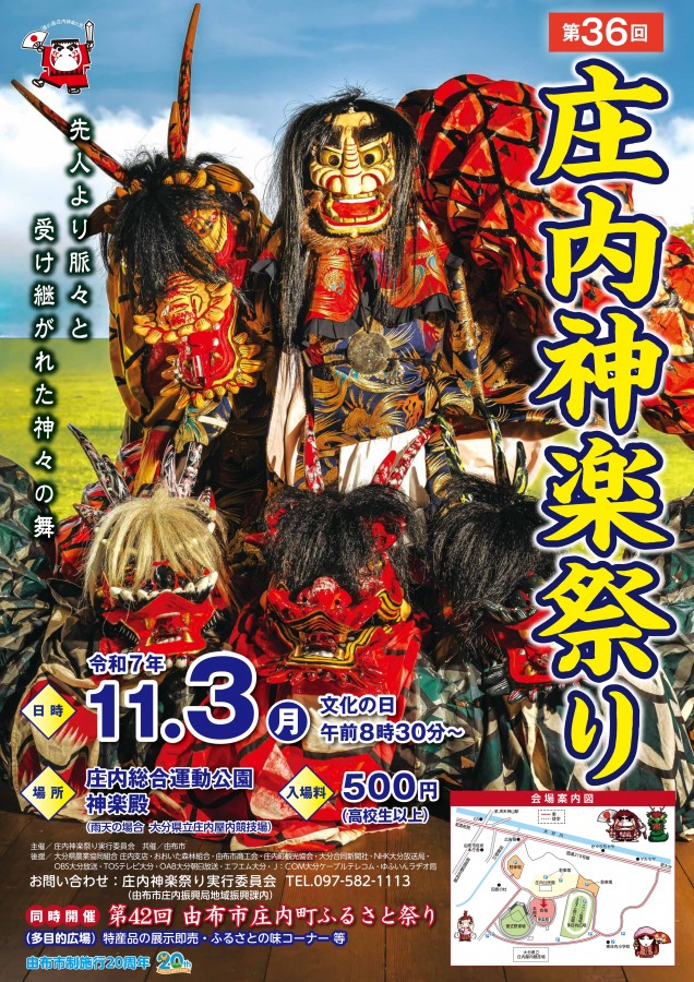 令和7年11月3日(文化の日)に、神楽の里由布市庄内町の庄内総合運動公園にて庄内神楽祭り・由布市庄内町ふるさと祭りを開催します。庄内神楽祭りは、庄内神楽を継承する町内神楽座のほかに、地元の保育園児や高校生などの多くの神楽団体が一堂に会します。朝から夕方まで一日中神楽三昧で過ごせます。