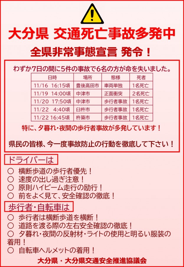 11月16日(日)から同月22日(土)までの7日間に、5件6名の交通死亡事故が連続的に発生し、交通事故死者数は11月24日現在36人と昨年同期比+13人と増加したことから11月25日(火)から12月4日(木)までの10日間、大分県交通安全推進協議会長(大分県知事)名による「交通死亡事故多発全県非常事態宣言」が発令されました。